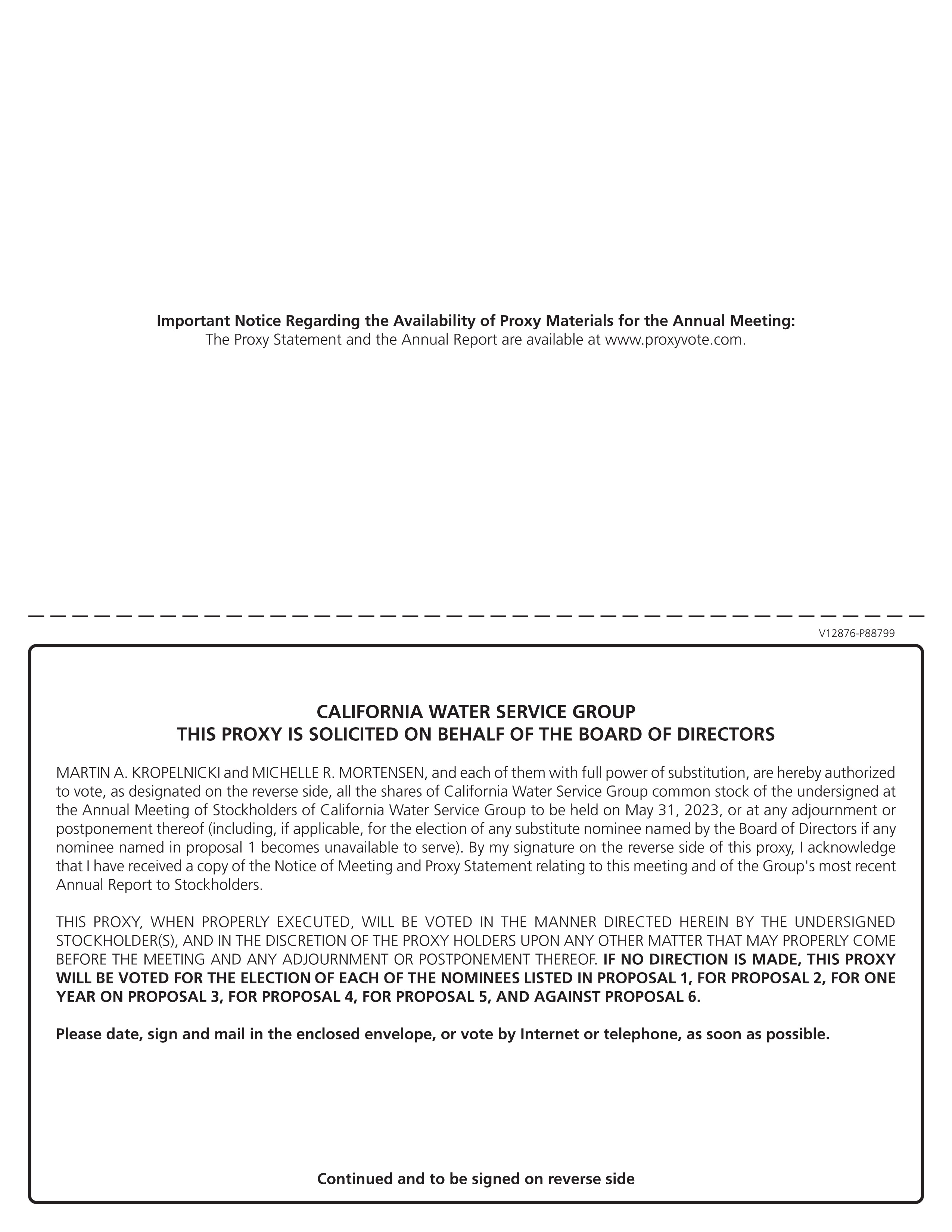 Important Notice Regarding the Availability of Proxy Materials for the Annual Meeting:The Proxy Statement and the Annual Report are available at www.proxyvote.com.V12876-P88799CALIFORNIA WATER SERVICE GROUPTHIS PROXY IS SOLICITED ON BEHALF OF THE BOARD OF DIRECTORSMARTIN A. KROPELNICKI and MICHELLE R. MORTENSEN, and each of them with full power of substitution, are hereby authorized to vote, as designated on the reverse side, all the shares of California Water Service Group common stock of the undersigned at the Annual Meeting of Stockholders of California Water Service Group to be held on May 31, 2023, or at any adjournment or postponement thereof (including, if applicable, for the election of any substitute nominee named by the Board of Directors if any nominee named in proposal 1 becomes unavailable to serve). By my signature on the reverse side of this proxy, I acknowledge that I have received a copy of the Notice of Meeting and Proxy Statement relating to this meeting and of the Group's most recent Annual Report to Stockholders.THIS PROXY, WHEN PROPERLY EXECUTED, WILL BE VOTED IN THE MANNER DIRECTED HEREIN BY THE UNDERSIGNED STOCKHOLDER(S), AND IN THE DISCRETION OF THE PROXY HOLDERS UPON ANY OTHER MATTER THAT MAY PROPERLY COME BEFORE THE MEETING AND ANY ADJOURNMENT OR POSTPONEMENT THEREOF. IF NO DIRECTION IS MADE, THIS PROXY WILL BE VOTED FOR THE ELECTION OF EACH OF THE NOMINEES LISTED IN PROPOSAL 1, FOR PROPOSAL 2, FOR ONE YEAR ON PROPOSAL 3, FOR PROPOSAL 4, FOR PROPOSAL 5, AND AGAINST PROPOSAL 6.Please date, sign and mail in the enclosed envelope, or vote by Internet or telephone, as soon as possible.Continued and to be signed on reverse side